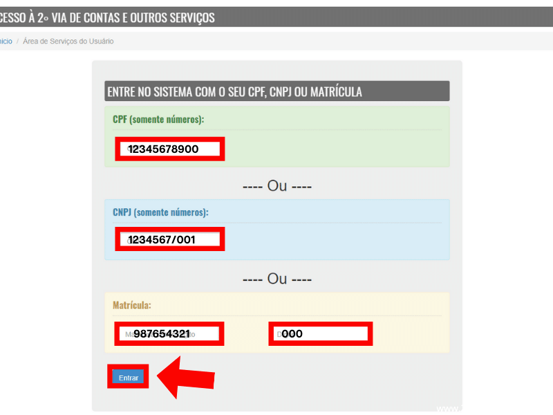 2. Escolha uma das opções de consultar, preencha seu CPF ou CNPJ ou número de matrícula