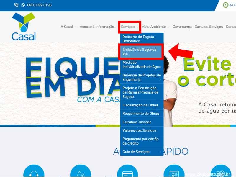 - Acesse o site oficial Casal e selecione a opção “Serviços” no menu principal e clique em “Emissão de Segunda Via”