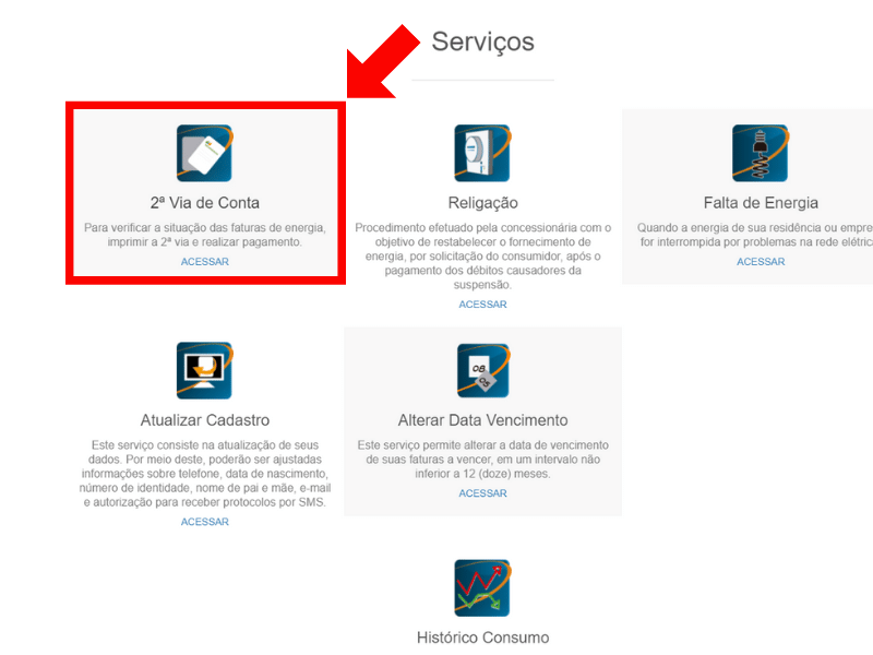 - Selecione a opção “2ª via da conta de luz” e pronto, baixe o documento em PDF no seu computador. Feito isso realize o pagamento.