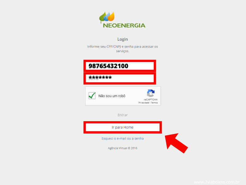 - Insira seu CPF, senha, selecione a opção “Não sou um robô” e clique em “Ir para a Home”