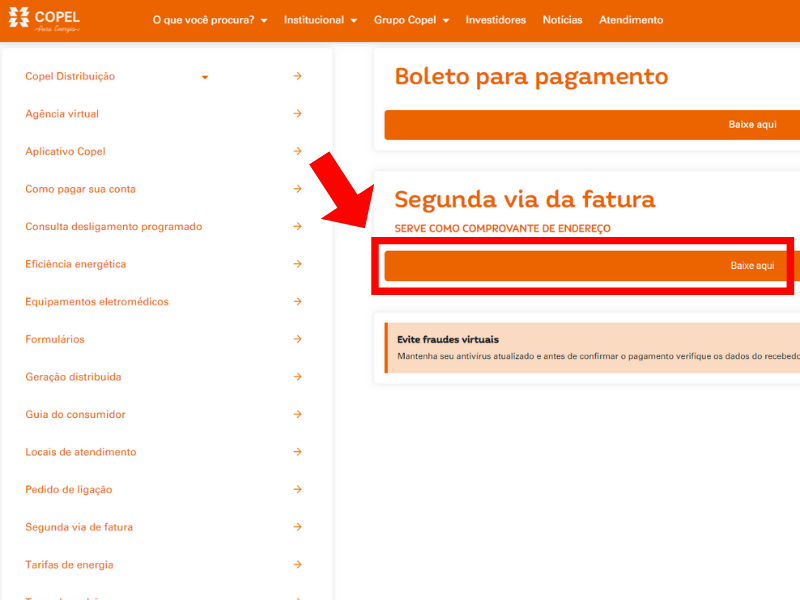 - Acesse o site oficial da Copel, logo na primeira página você vai ver “Segunda Via da Fatura”, clique em “Baixar aqui”