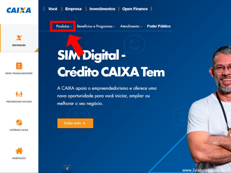 - Acessar o site da Caixa clique na aba “Produtos”