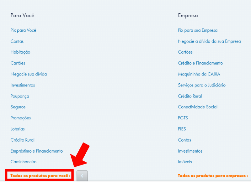 - No site da Caixa, na guia “Produtos”, clique em “Todos os produtos para você”