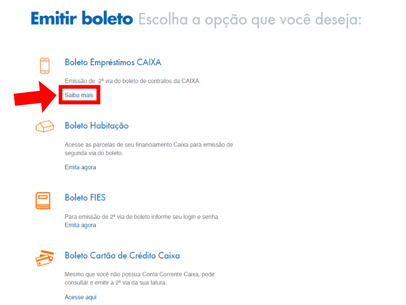 No site da Caixa, você pode emitir segunda via de boletos de empréstimos, financiamento, boleto expresso, FIES, programas de habitação, e muito mais.